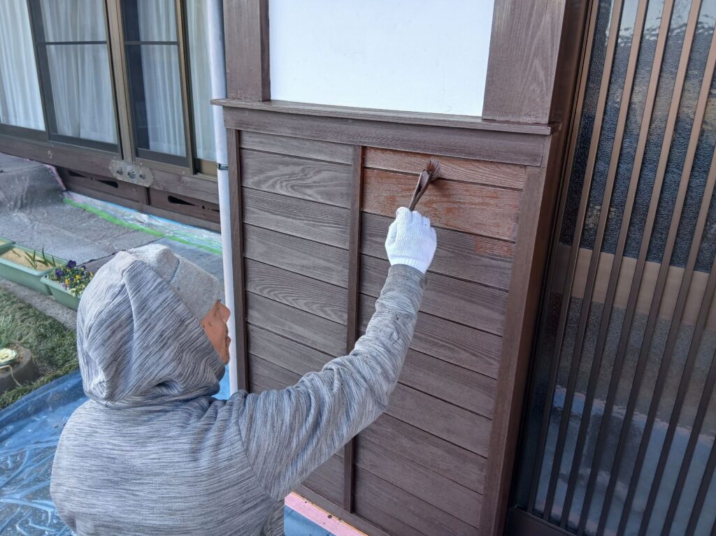 ■ムラを出さない職人技の「上塗り」 現在は「上塗り」の真っ最中! 木目に沿って、刷毛で丁寧に塗り込んでいきます。 ベンガラ塗装は乾燥が早いため、手際よく、かつ均一に広げないとムラになってしまいます😫