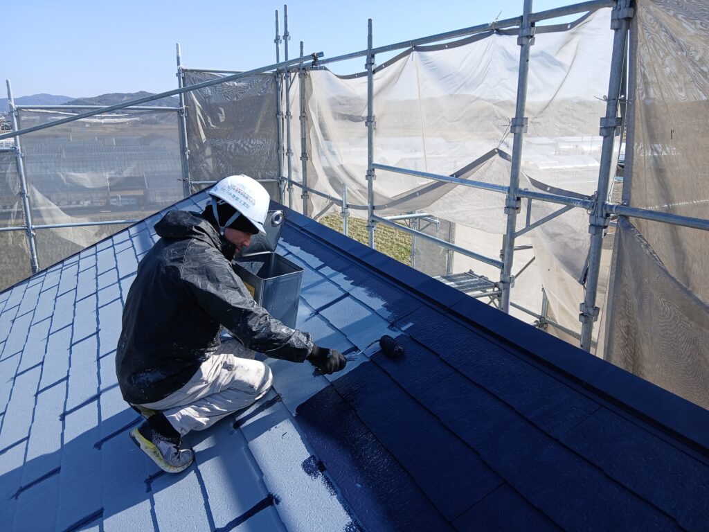 本日は、東広島市八本松にて「カラーベスト屋根の中塗り」と「付帯部の中塗り」を行いました🎨