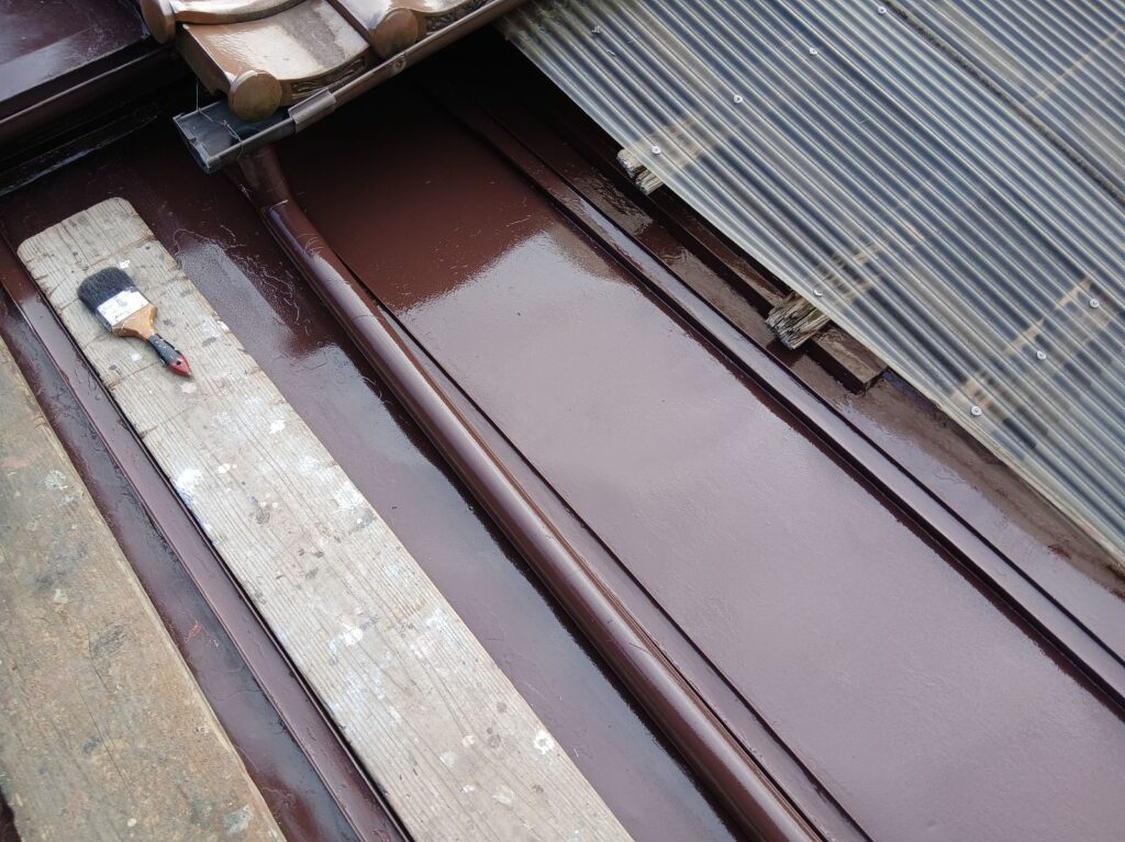 瓦棒屋根は金属製のため、サビを防ぎ、雨をしっかり弾く力が何より重要です。下塗りでサビ止めをバッチリ効かせた後、本日は仕上げとなる上塗り塗料をたっぷりと塗り重ねていきました!