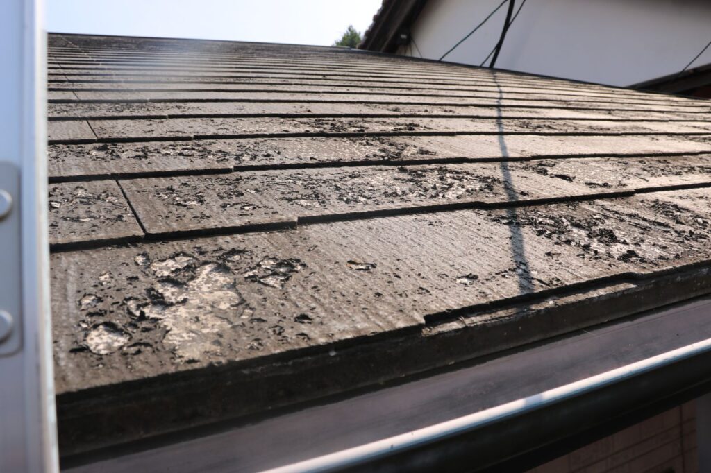 黒い部分が旧塗膜で、グレーっぽく見えるのが屋根材の素地です。