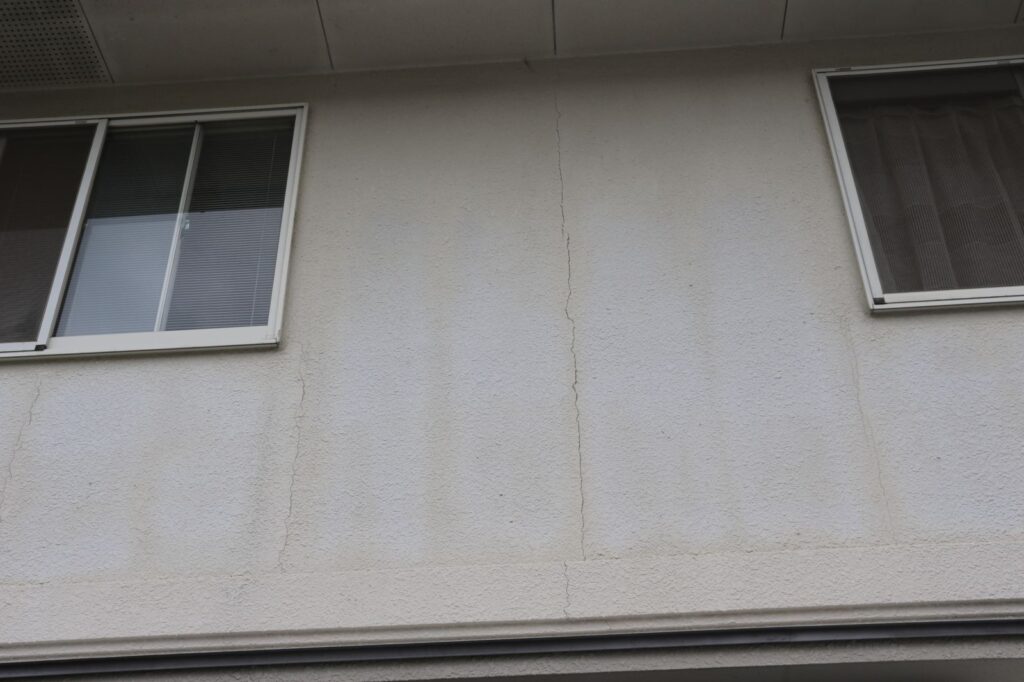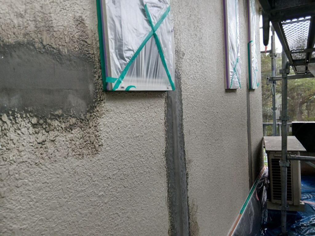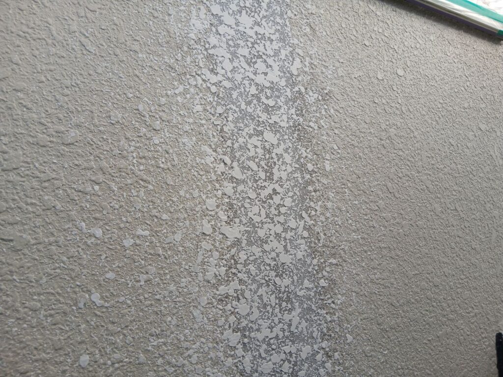 外壁のジョイントがひび割れていたので、塗膜の撤去、薄塗り補修をしていきます。