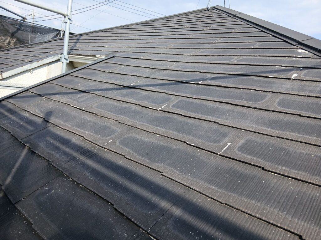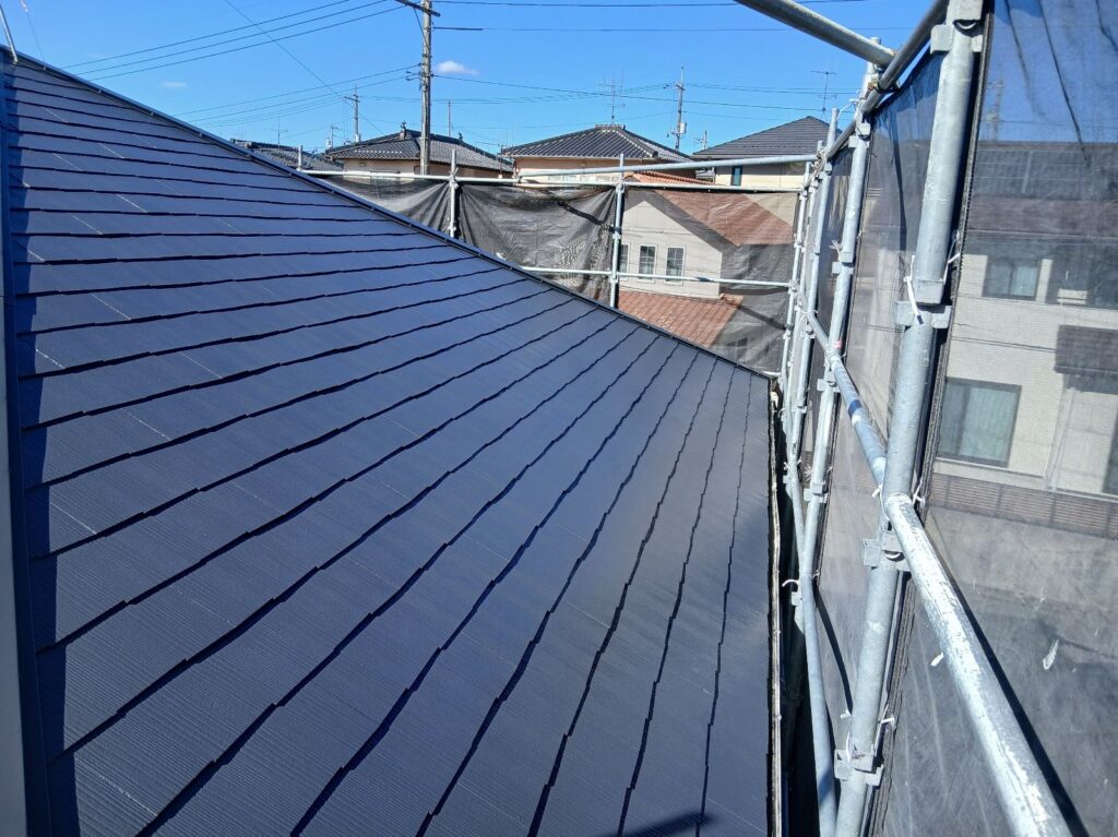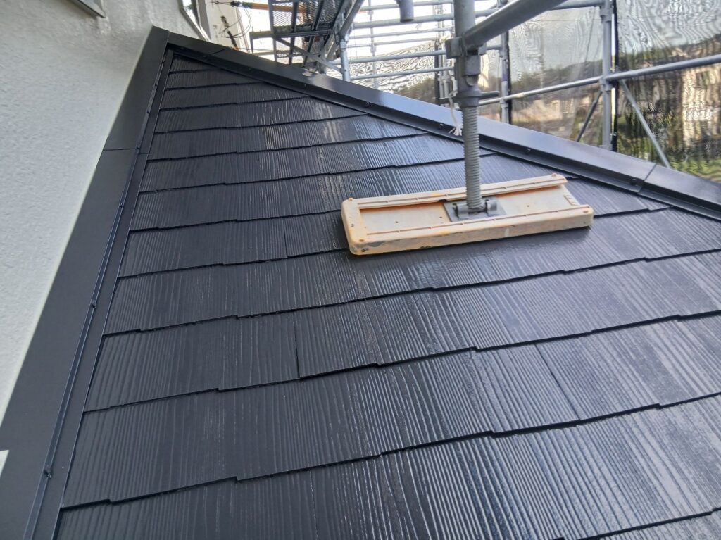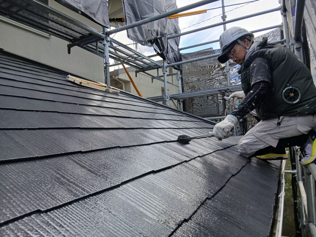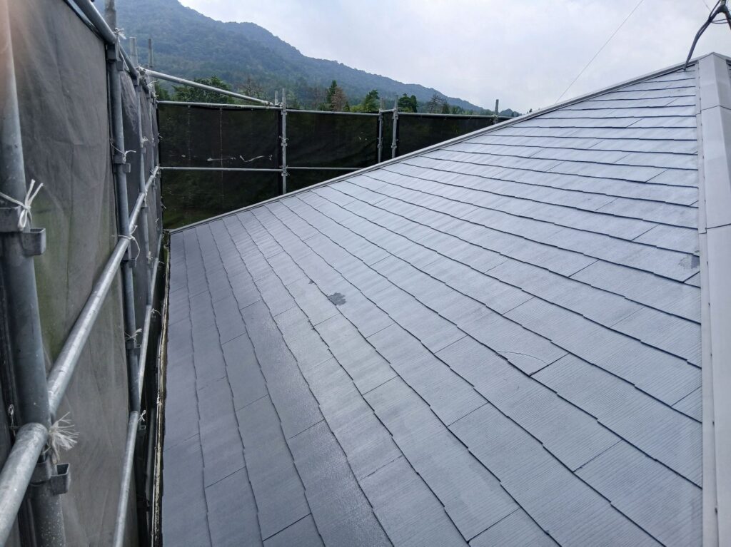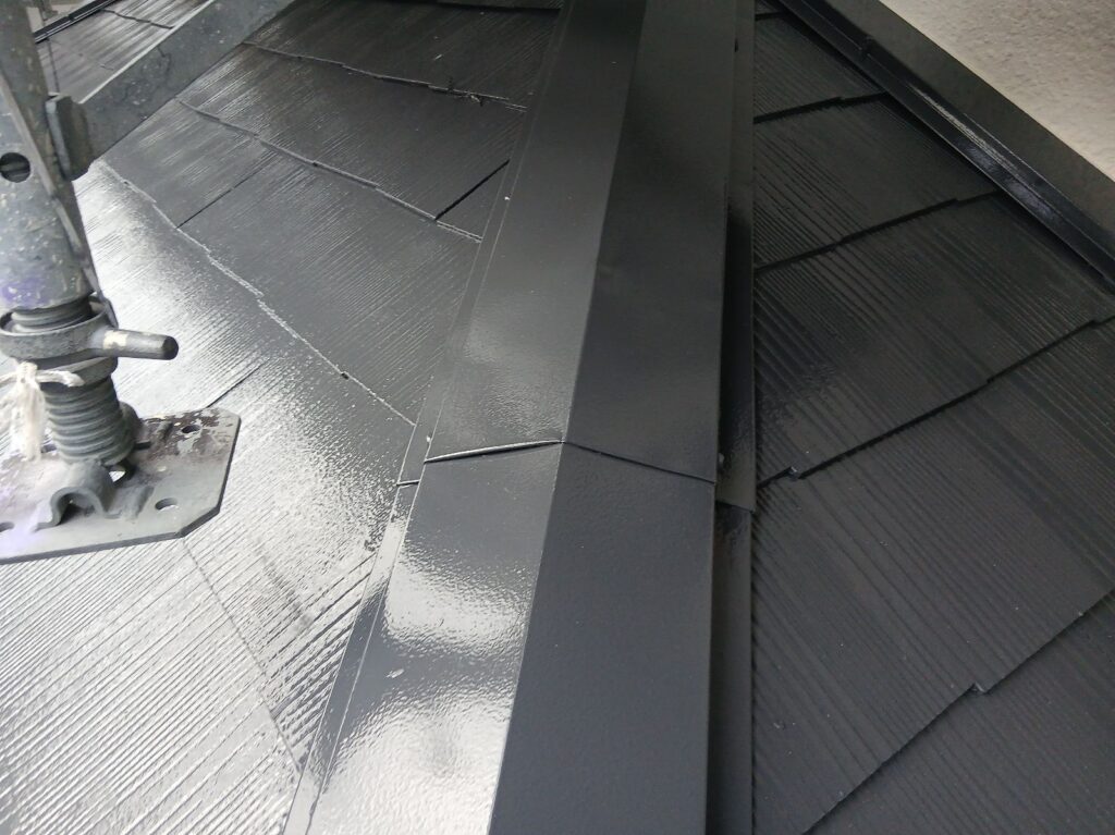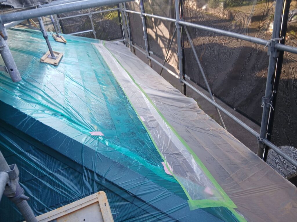 外壁の塗装が終了し、養生を取ったら中塗りまでだった下屋根を塗装します。