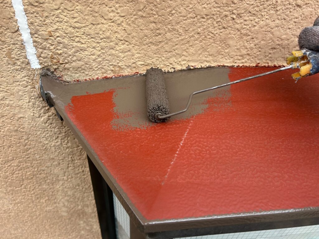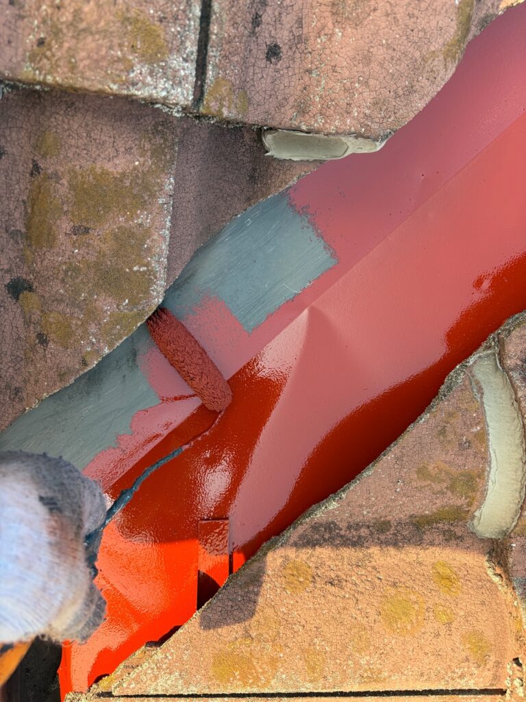 屋根の板金部分に、錆止めを塗装します。